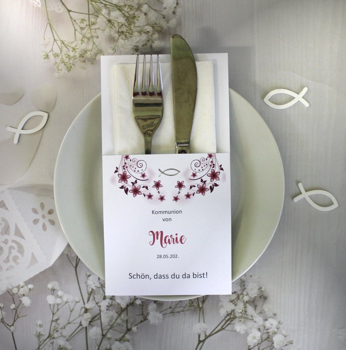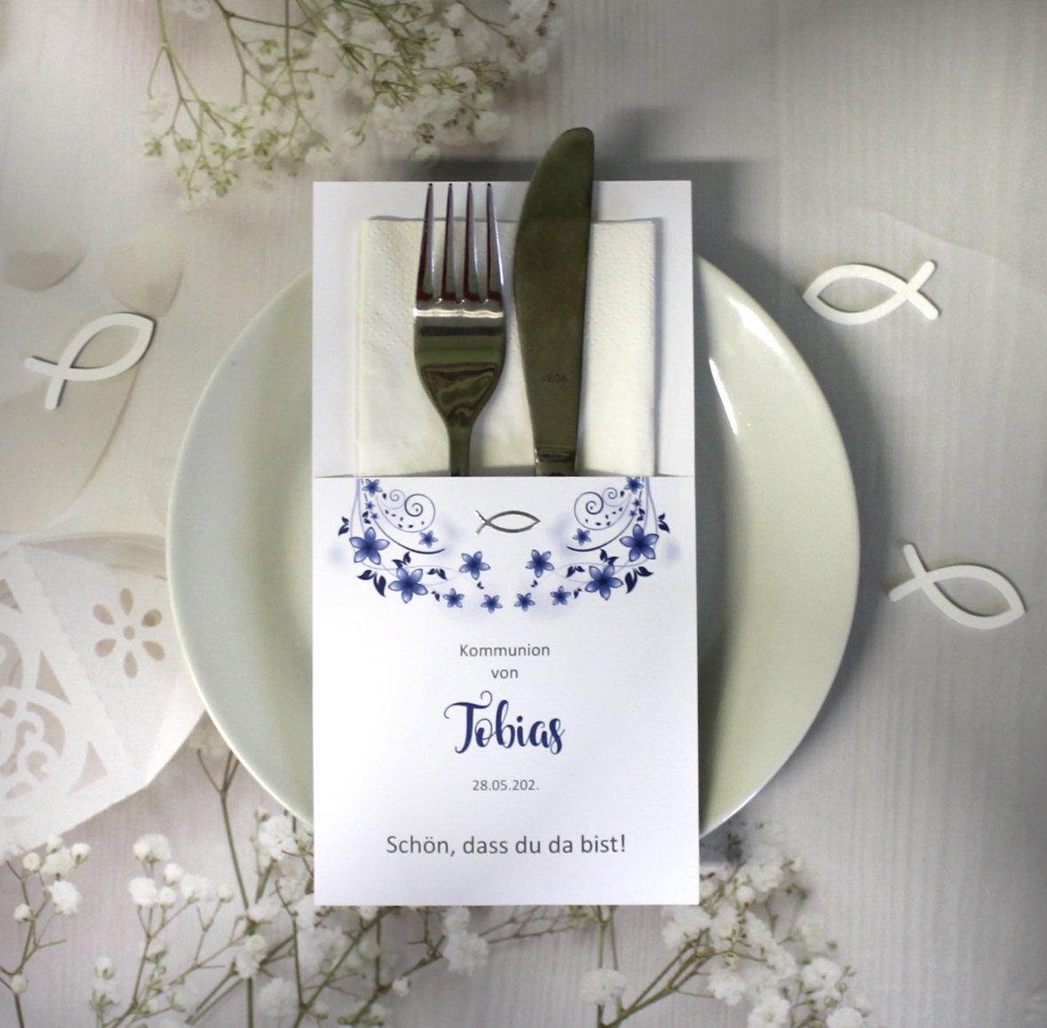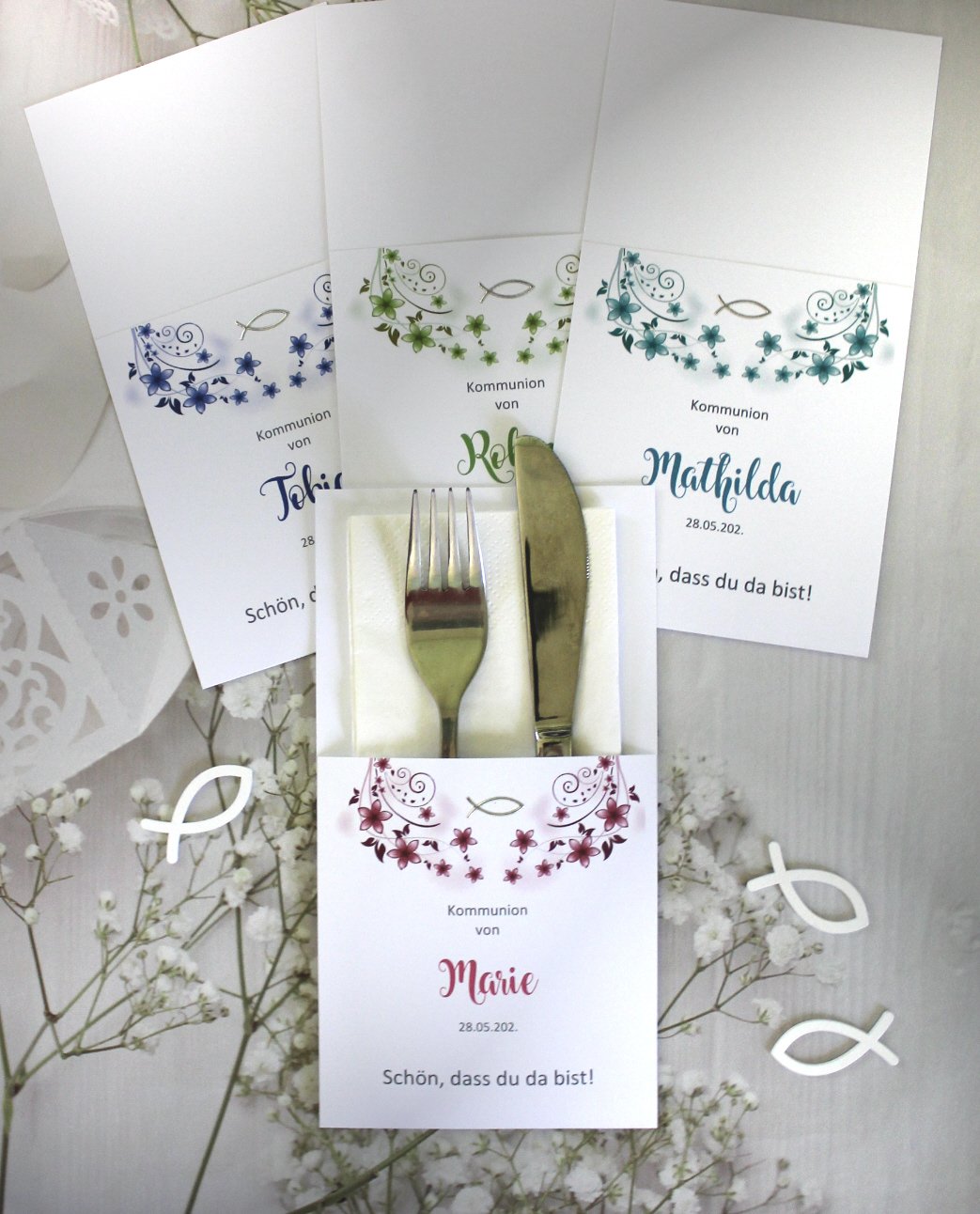 Unsere Bestecktaschen sind nicht nur ein elegantes Detail, sondern ein echter Blickfang auf jedem festlich gedeckten Tisch. Sie verbinden Stil und Funktionalität auf charmante Weise – ideal als Tischdekoration und zugleich als persönliches Highlight für Ihre Gäste. Jede Bestecktasche wird mit Liebe zum Detail gefertigt und kann perfekt mit dem Design Ihrer Gastgeschenk-Kerzen kombiniert werden. So entsteht ein harmonisches Gesamtbild auf Ihrer festlichen Tafel.