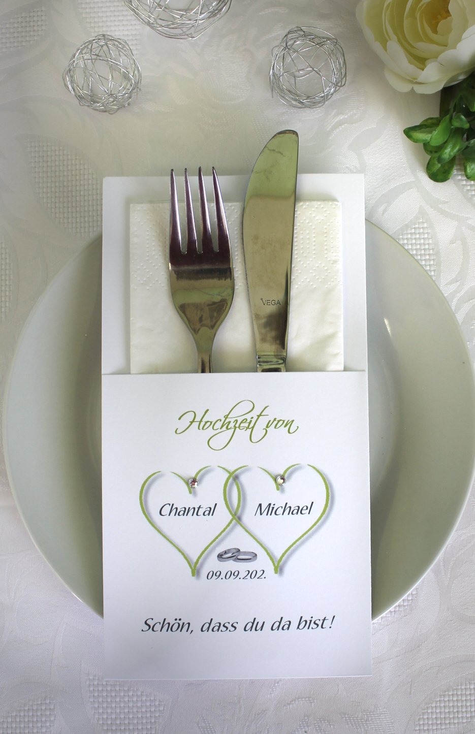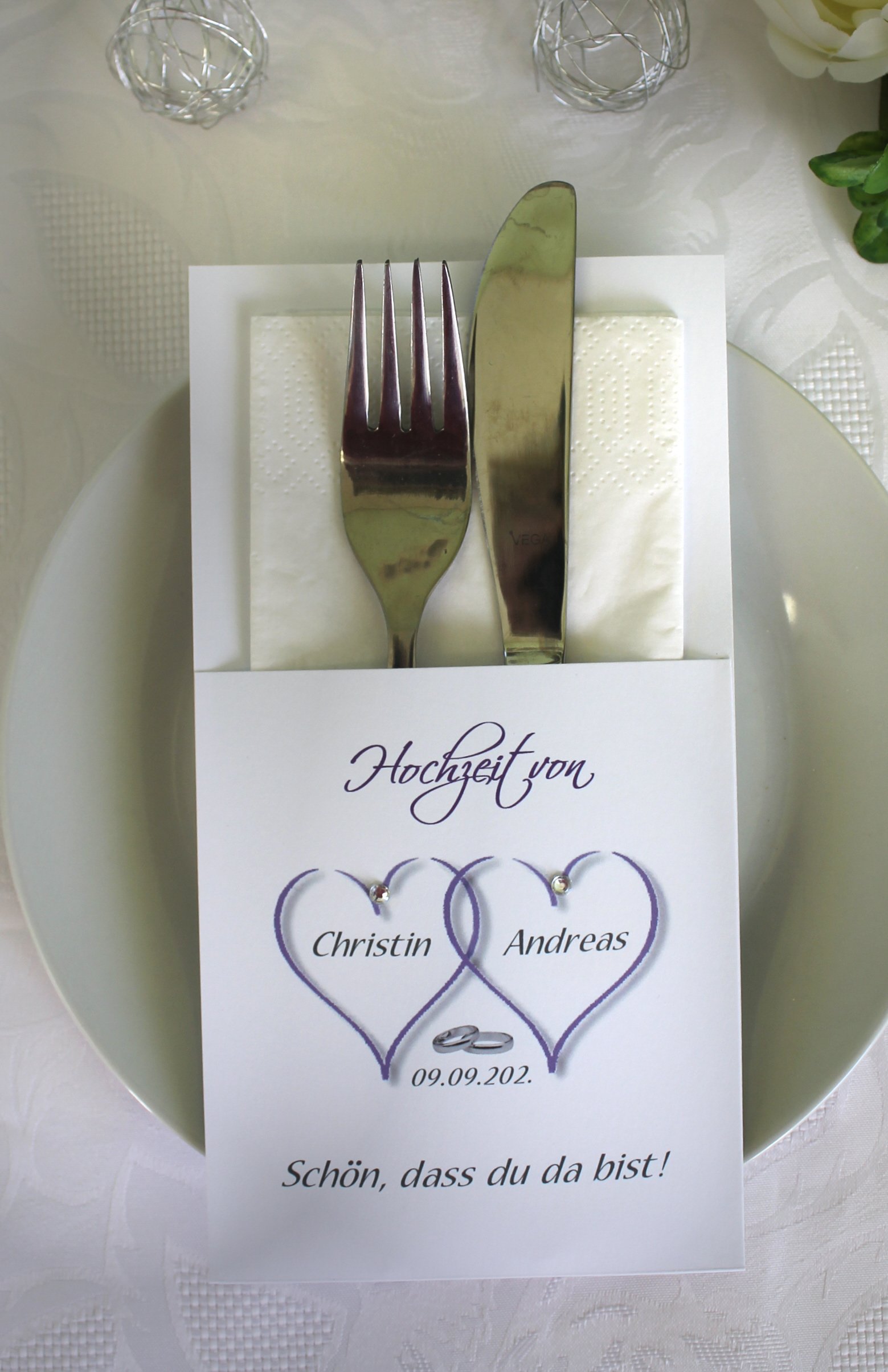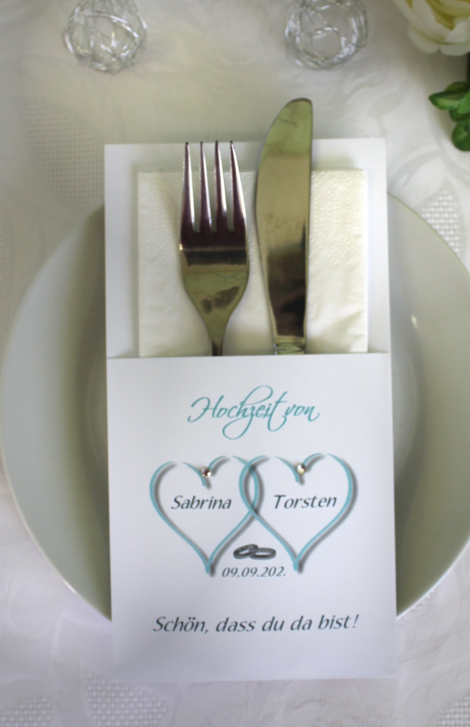 Bestecktasche zur Hochzeit „2 Herzen“ personalisiert, Design 10001 wahlweise in 5 Farben: türkis-altrosa-grün-lila-bordeauxrot