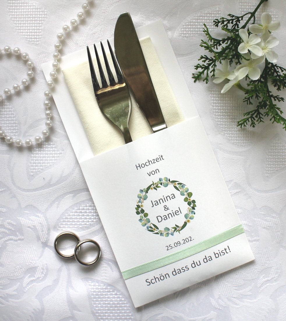 Bestecktasche zur Hochzeit, Eukalyptus Kranz personalisiert, Design 403Bestecktasche zur Hochzeit, Eukalyptus Kranz personalisiert, Design 403