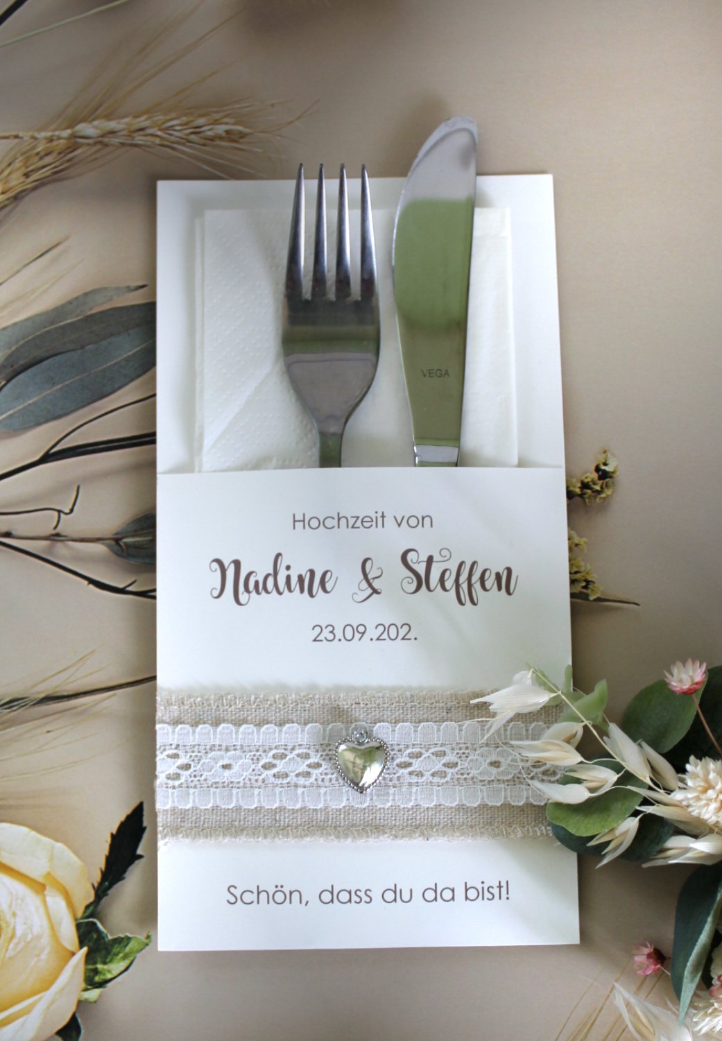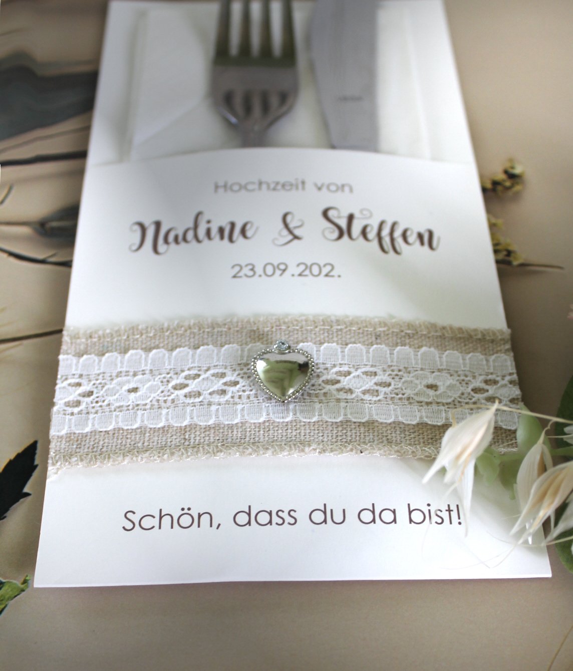 Bestecktasche für Ihre Hochzeit aus Karton in Leinenoptik,