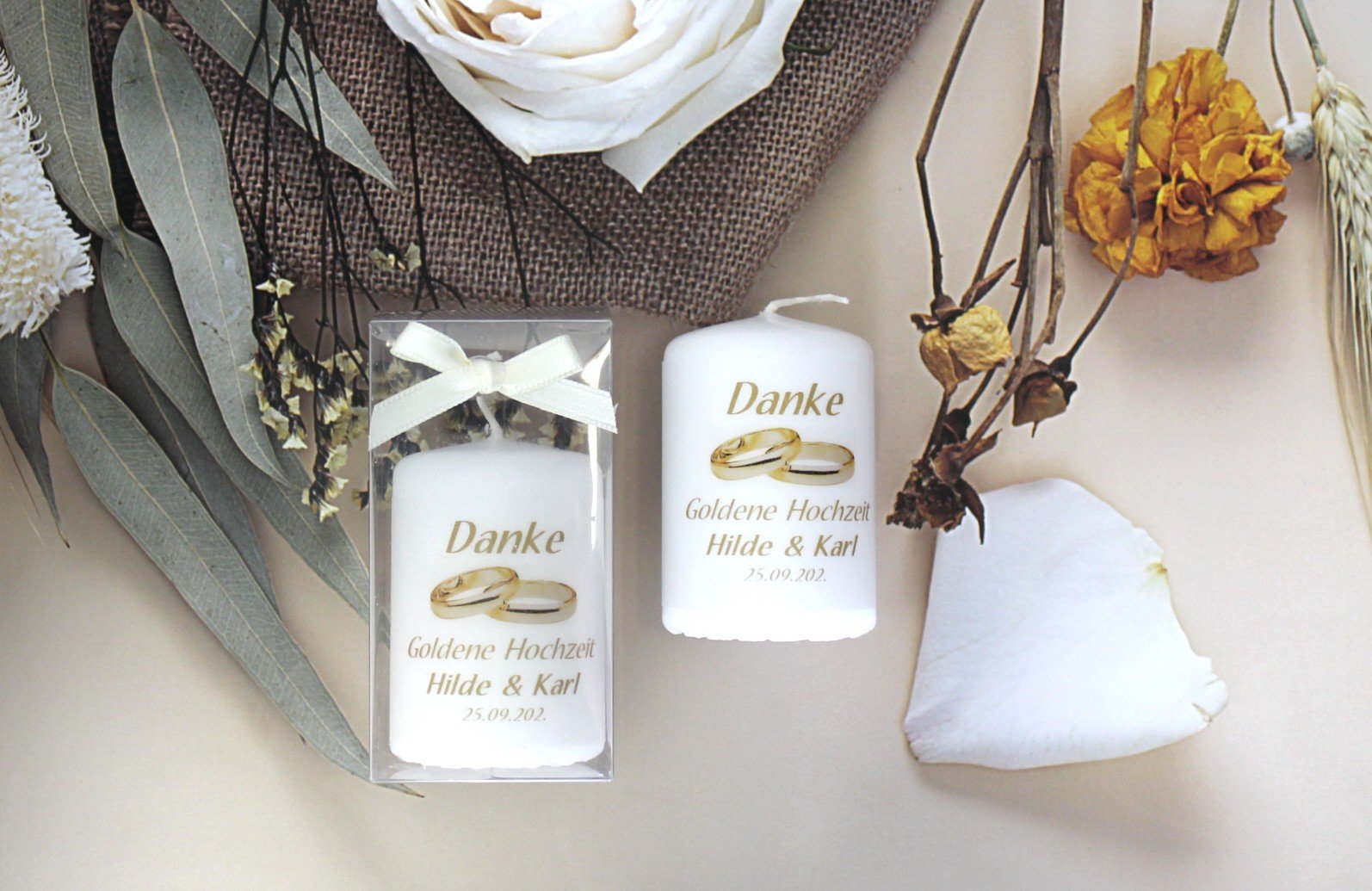 Gastgeschenk Kerze zur Goldenen Hochzeit "Ringe" incl. Namen und Datum, Design 501Gastgeschenk Kerze zur Goldenen Hochzeit „Ringe“ incl. Namen und Datum, Design 501