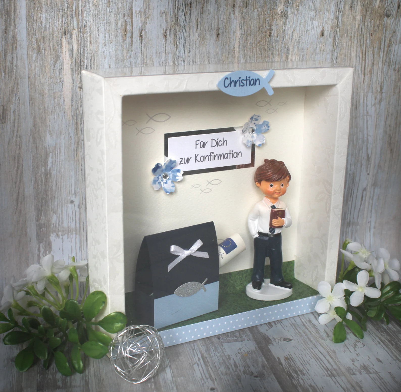 Geschenkerahmen zur Kommunion, Konfirmation oder Firmung – handgemachte Geldgeschenk-Verpackung mit Figur