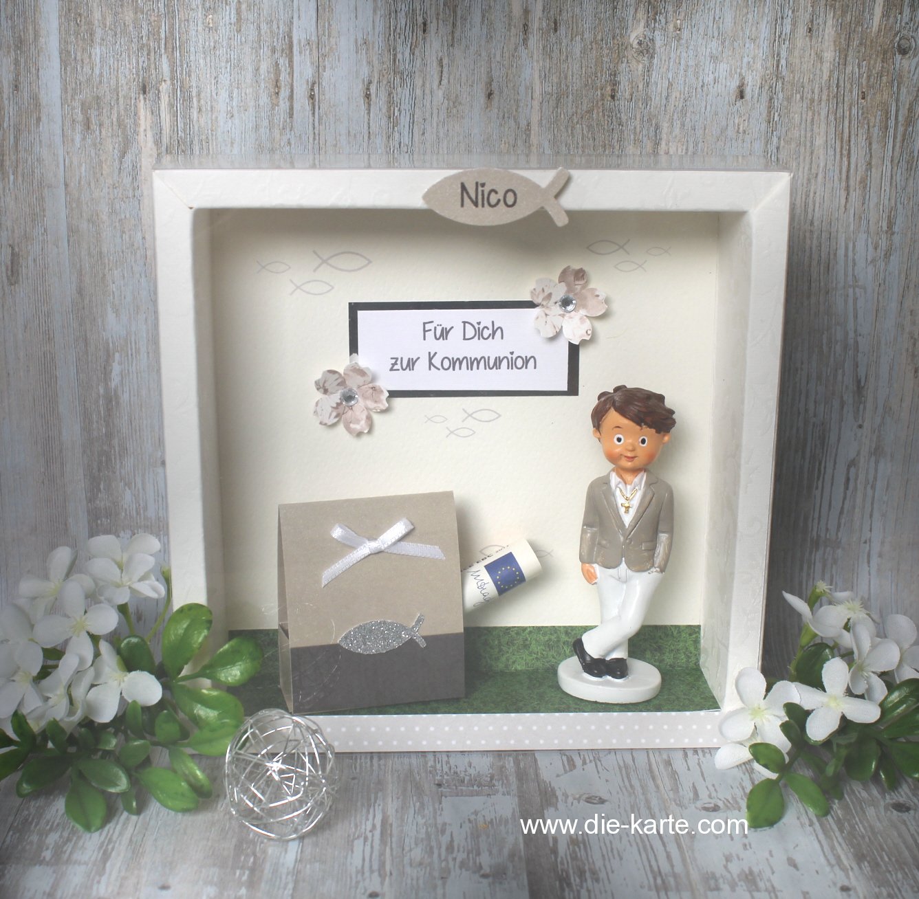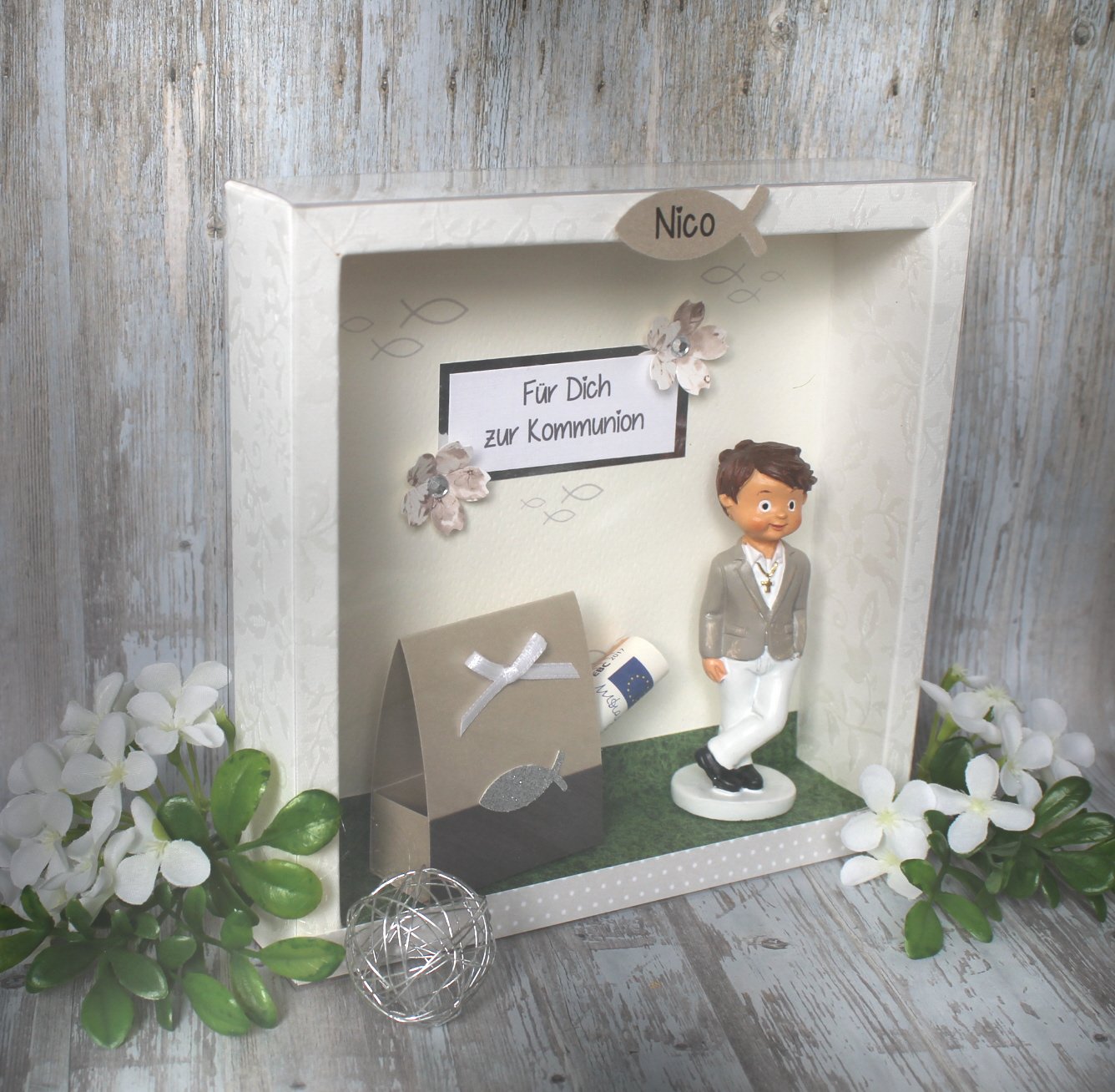 Geschenkerahmen zur Kommunion, Konfirmation oder Firmung – handgemachte Geldgeschenk-Verpackung mit Figur