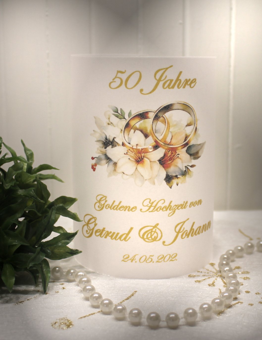 Lichthülle, Windlicht Pergament zur goldenen Hochzeit „Ringe“ mit Perle Design GO04 WL