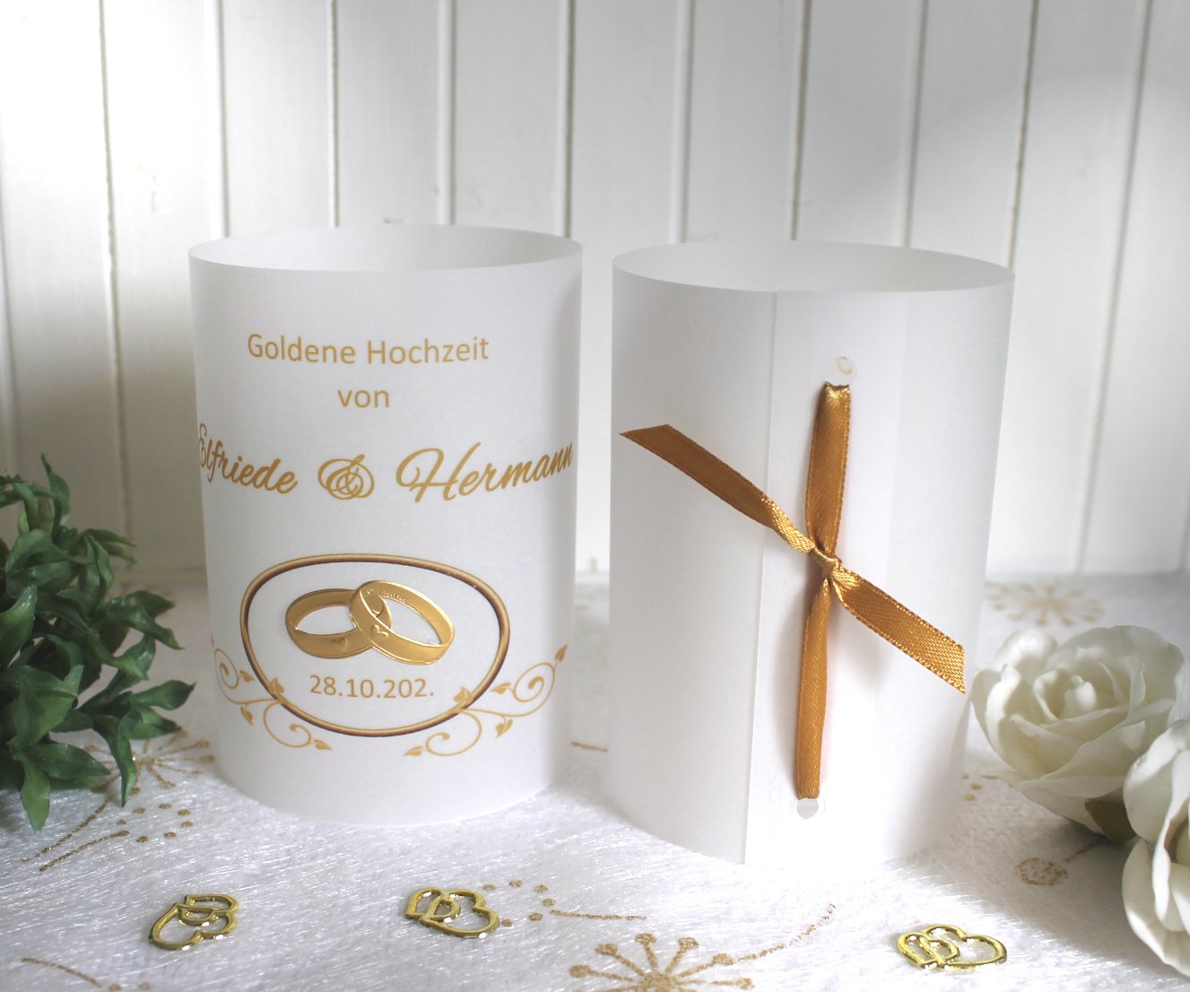 Windlichter aus Pergament, Pergament Windlichter, Windlichter Goldene Hochzeit, Tischdeko Goldene Hochzeit, Hochzeitsdeko Goldene Hochzeit