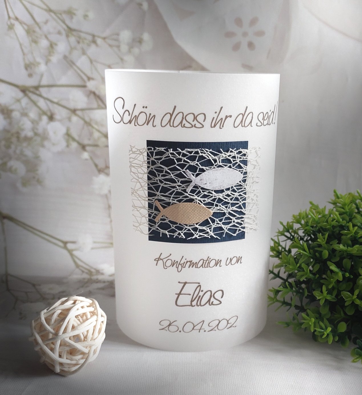 Lichthülle, Windlicht Pergament zur Konfirmation, Kommunion, Firmung oder Taufe passend zur Einladung Design K02WL
