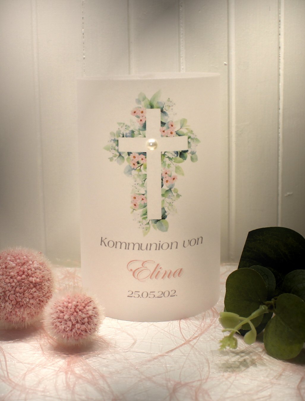 Lichthülle, Windlicht Pergament zur Taufe, Konfirmation oder Kommunion „Blütenkreuz“ Design K36 WL