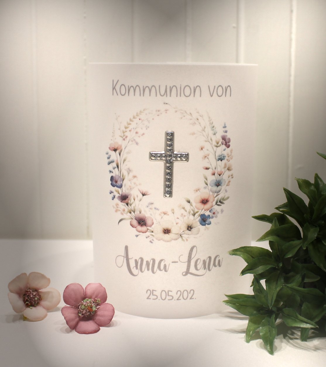 Lichthülle, Windlicht Pergament zur Taufe, Konfirmation oder Kommunion „Kreuz mit Blüten“ Design K31 WL