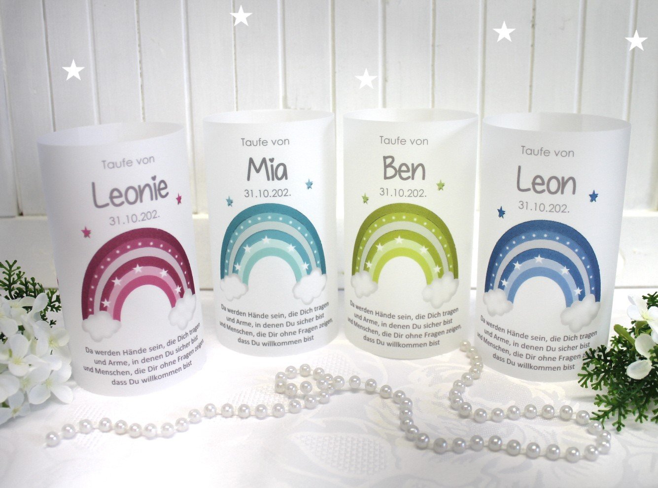 Lichthülle, Windlicht Pergament zur Taufe "Regenbogen" in 4 Farben personalisiert Design 210Lichthülle, Windlicht Pergament zur Taufe „Regenbogen“ in 4 Farben personalisiert Design 210